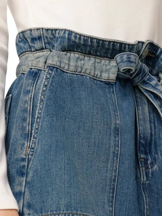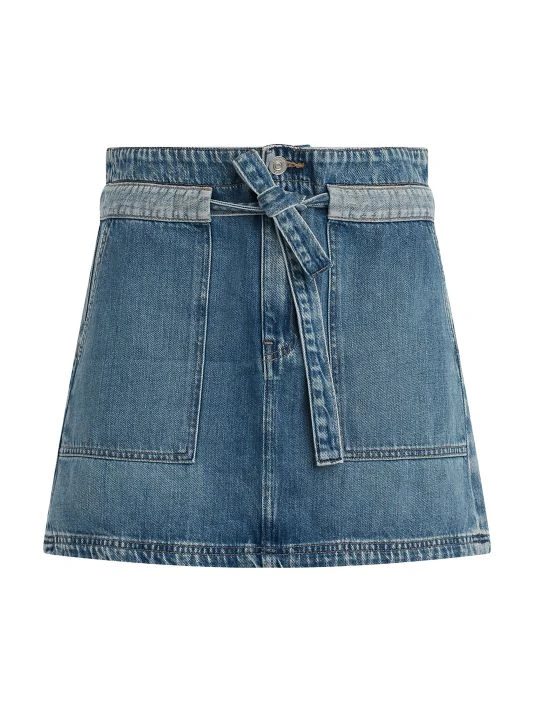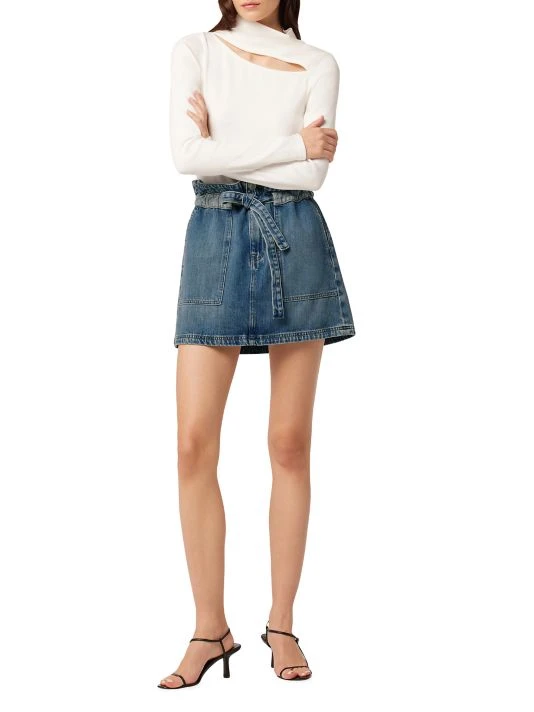 This denim miniskirt from Hudson Jeans features a paperbag waist and front patch pockets. A two-tone drawstring-style tie waist completes the look.