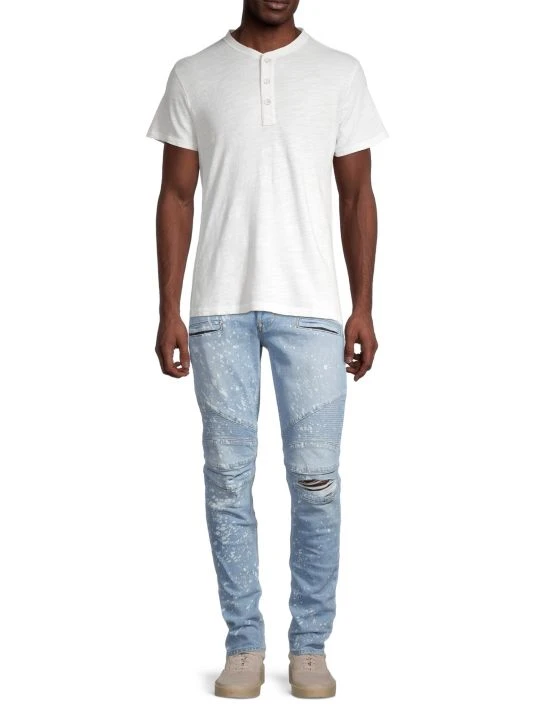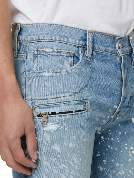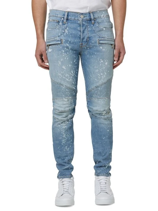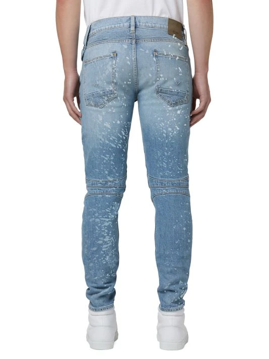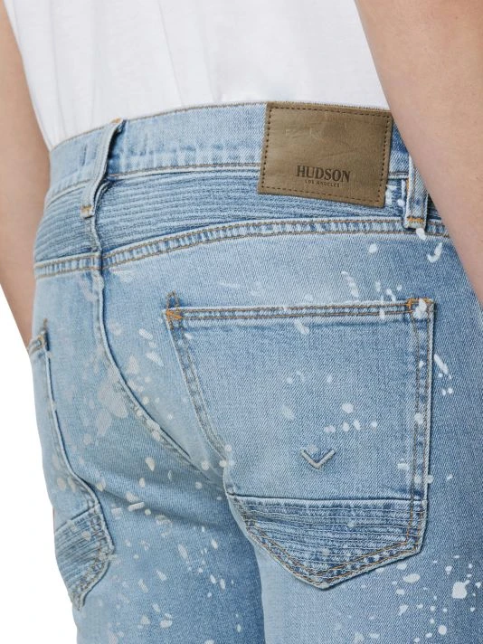 A fresh take on a Hudson favorite, the moto-inspired Blinder Biker V2 Skinny is cut extra-slim from premium denim with a hint of stretch for added softness, comfort, and flexibility. Speckled with bleach, the Indigo Spray wash features two front zip pockets and signature ribbed leg panels.