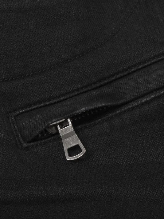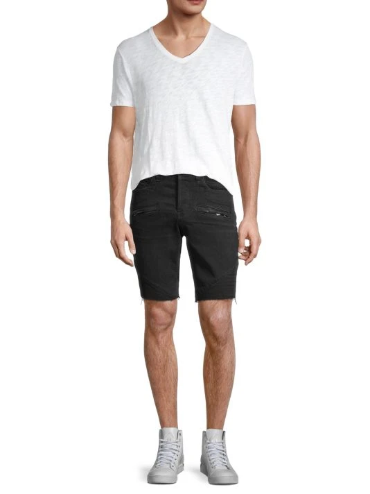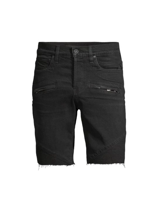 These denim shorts feature a classic zip fly with button closure and a raw hem.