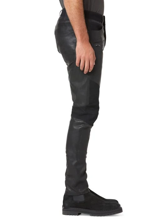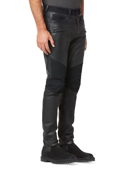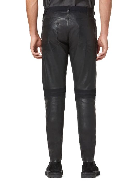 Made of leather, these skinny jeans feature thigh zip pockets in addition to a five-pocket style.
