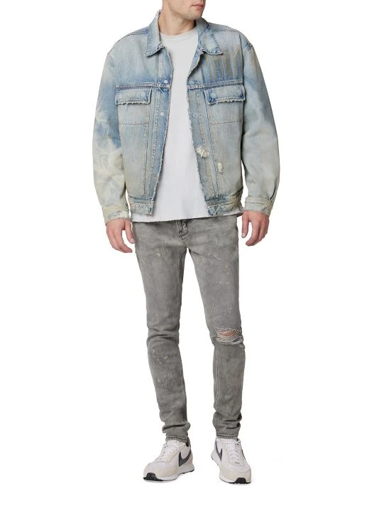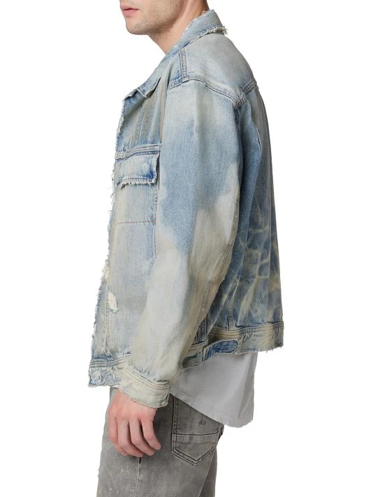 Crafted of 100% cotton denim, this trucker jacket is cut for a boxy silhouette, styled with raw hems, and finished with a distressed washed-out effect.