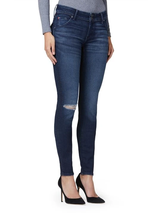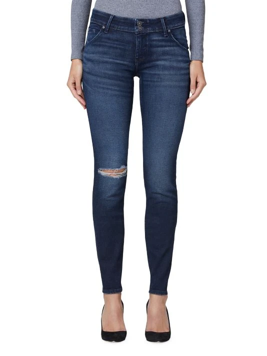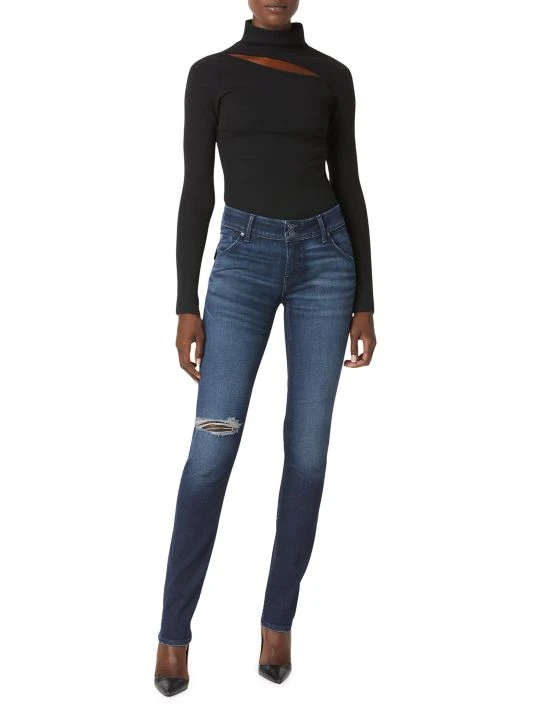 These mid-rise skinny jeans are made of stretch-denim with a distressed detail at the leg.