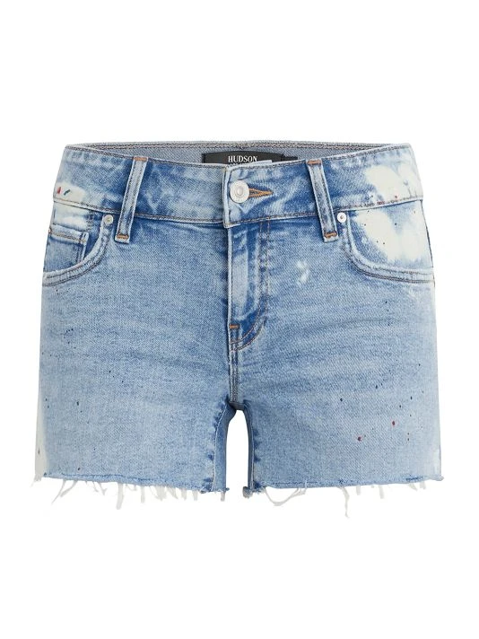 These dyed denim shorts feature a raw hem and brand embroidery at back patch pocket.