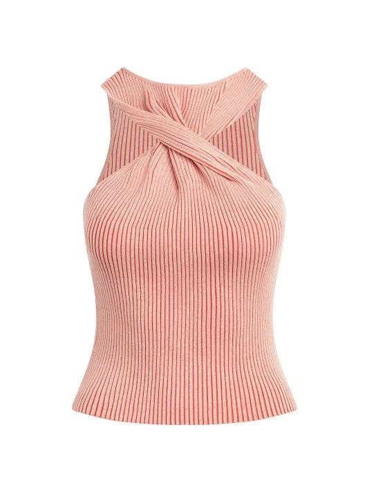 Allover ribbing shapes this knit tank top, designed with a unique twisted halter neckline.