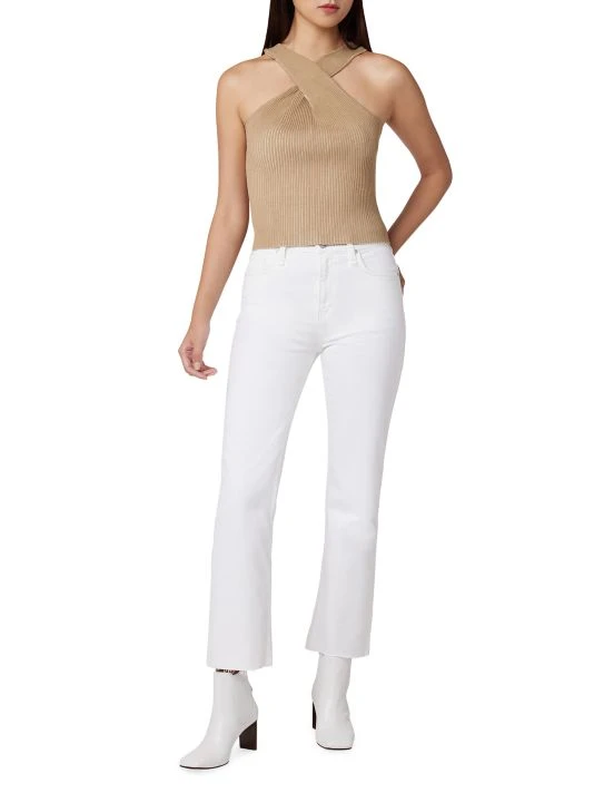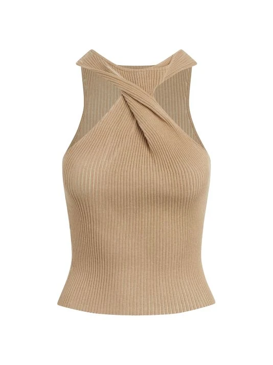 Cut in a cropped silhouette, this rib-knit tank top is defined by a twisted crisscross neck.