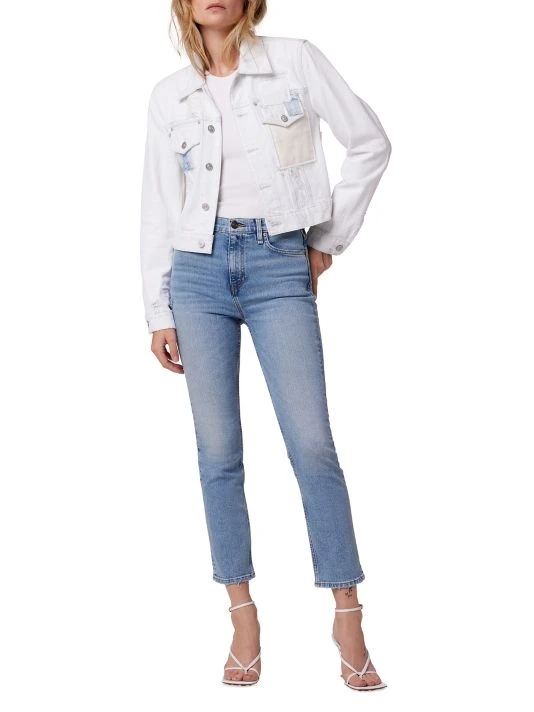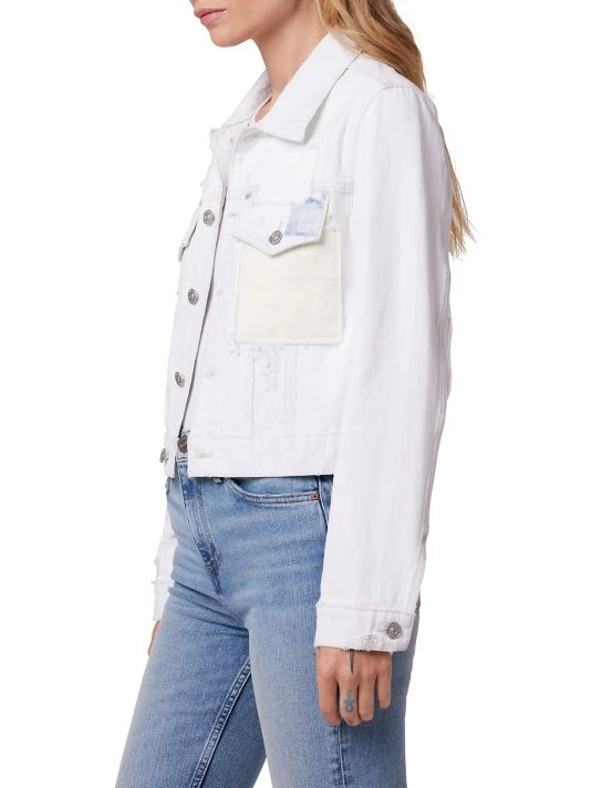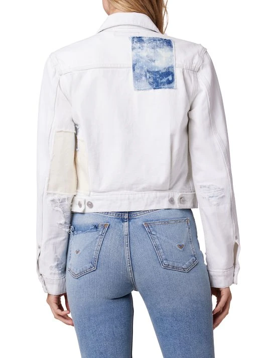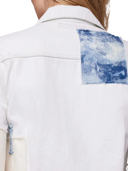 Cut in a cropped silhouette, this cotton denim jacket is enhanced by scattered distressing and patchwork embellishments.