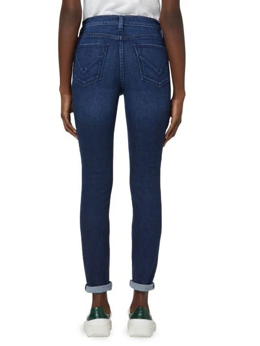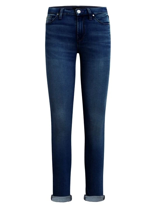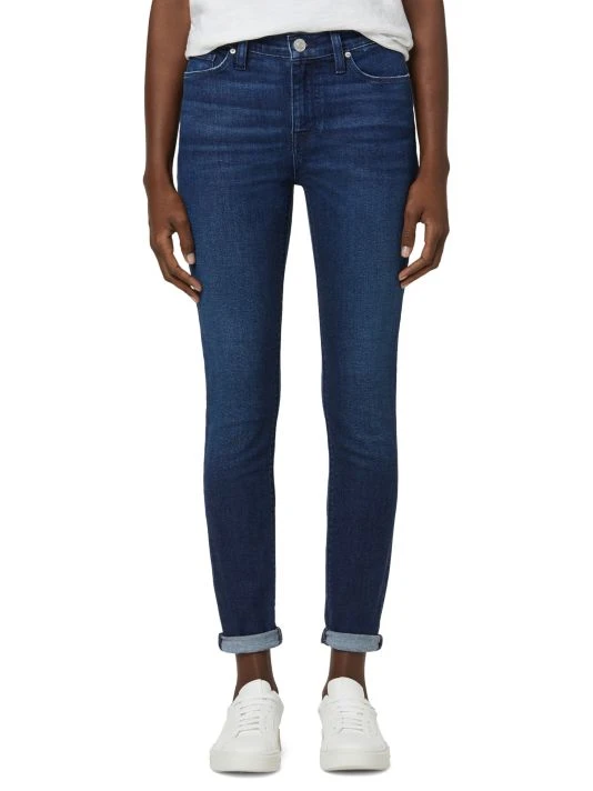 Dark wash skinny jeans with a cuffed ankle.