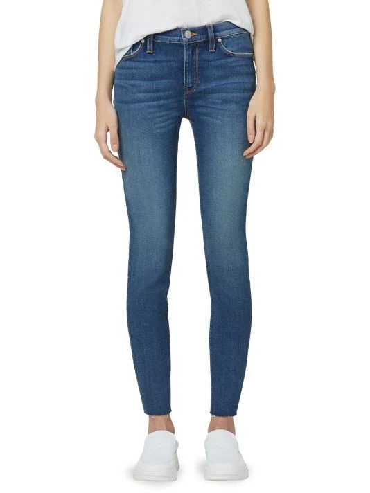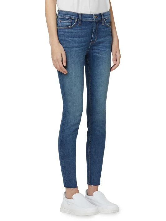 Wear-with-everything medium blue super skinny jeans with an unfinished hem.