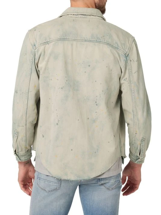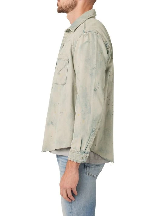 This denim shirt in a lived-in finish is accented with paint splatter details featuring a raw-edge finish at the collar and hem.