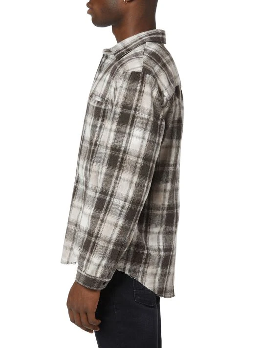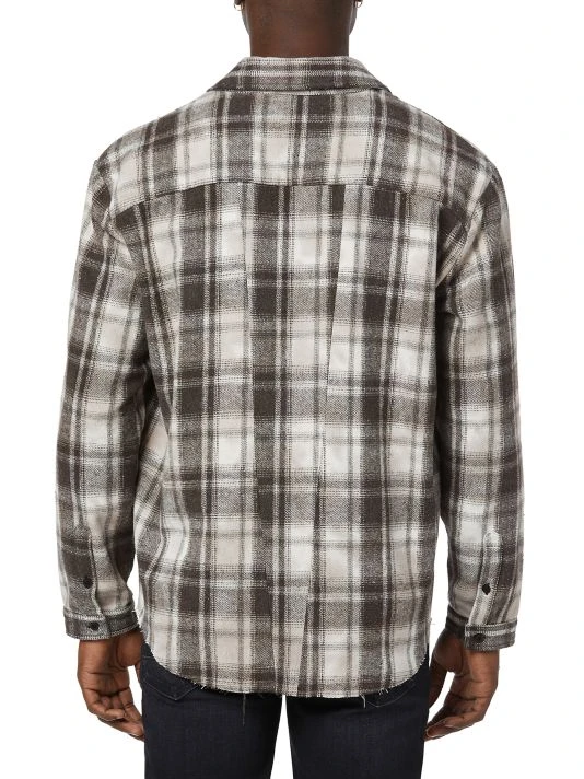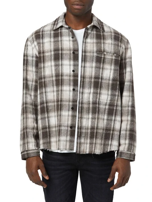 This plaid polyester shirt features a spread collar and chest slip pockets.