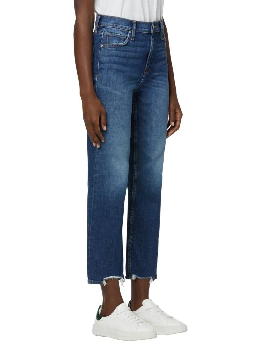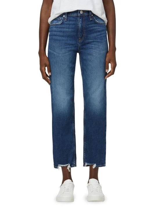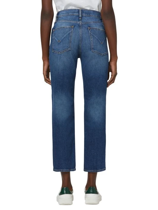 Classic mid-wash blue jeans with fading and a flattering high-rise, straight fit.