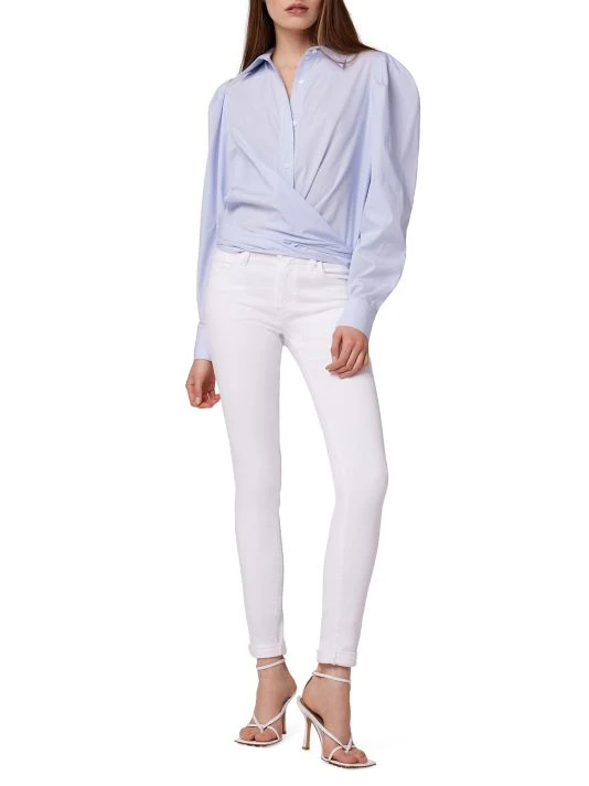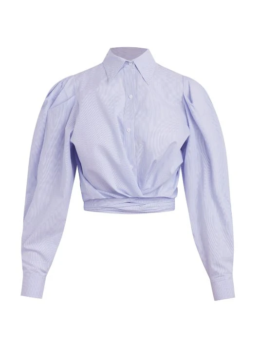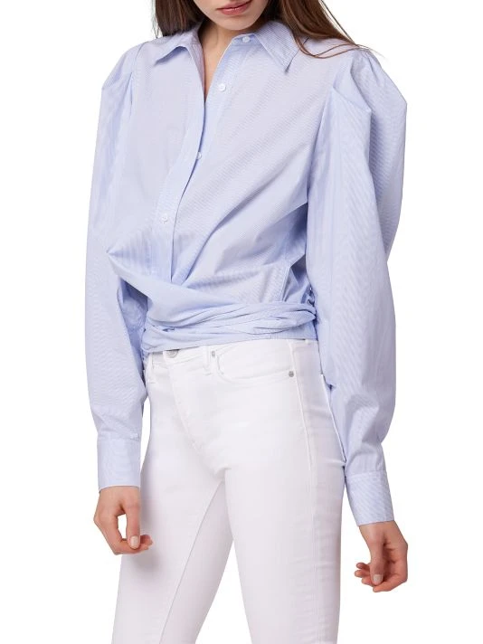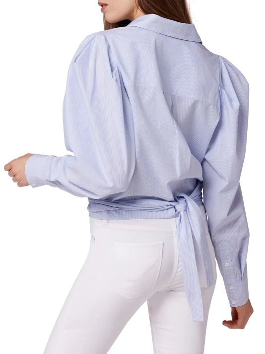 Crafted of cotton poplin, this striped button-front shirt is enhanced by long balloon sleeves and a self-tie wrap hem.