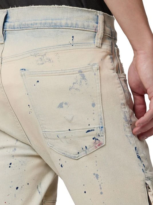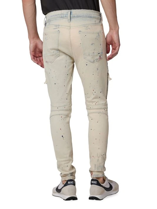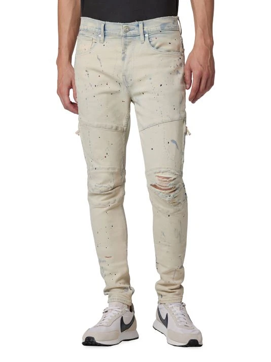 Crafted of stretch cotton-blend denim treated with a distressed paint-splatter effect, these skinny jeans showcase biker-style zippers and panels.
