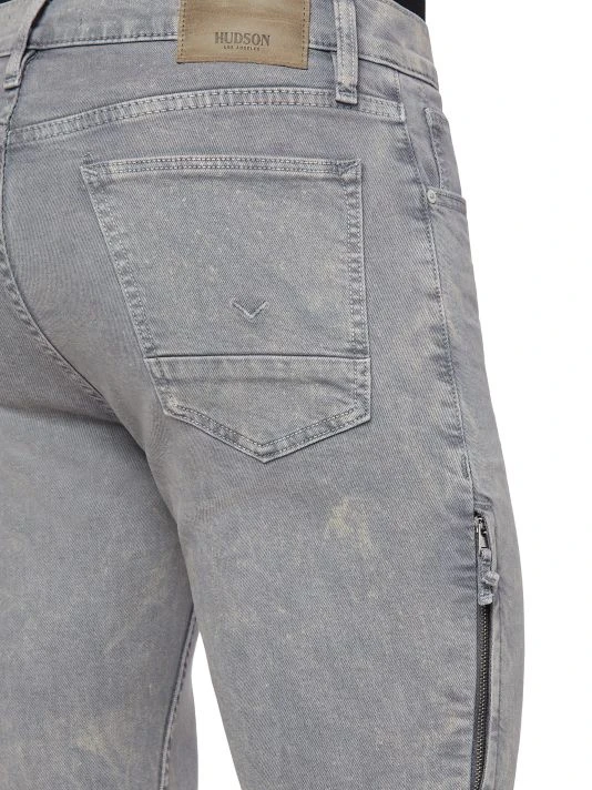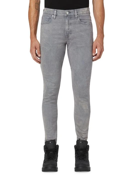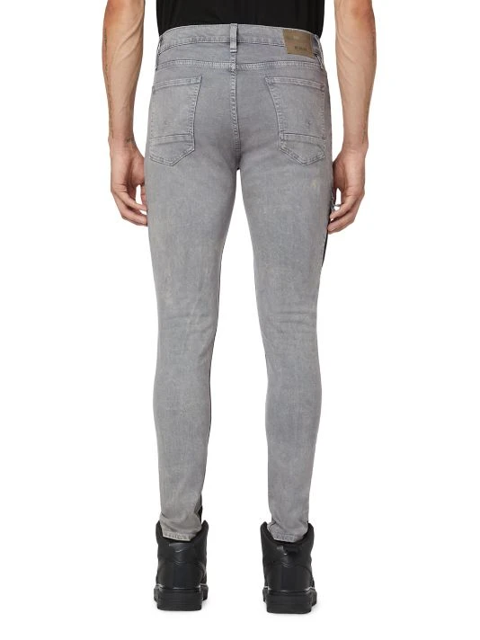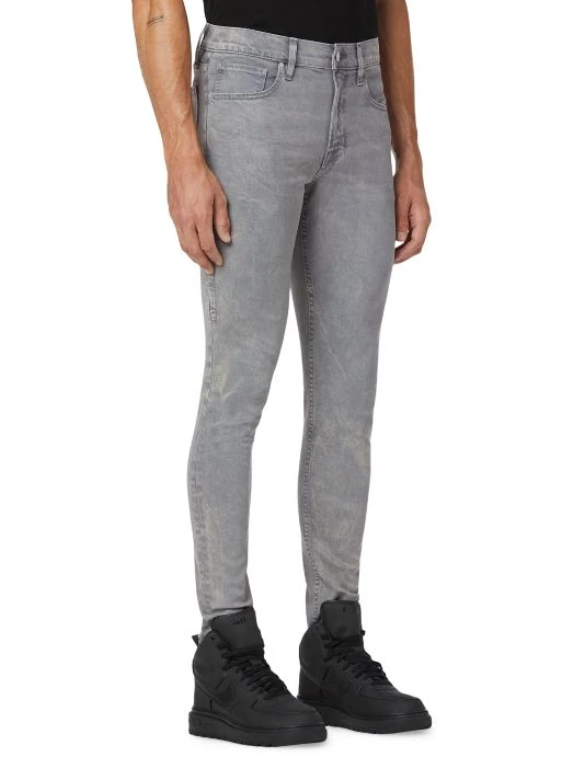 A pair of skinny jeans with a distressed coating.