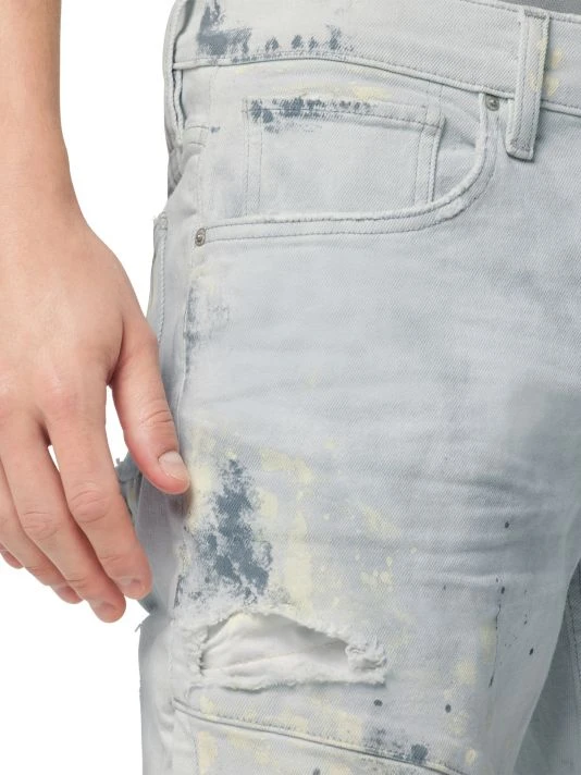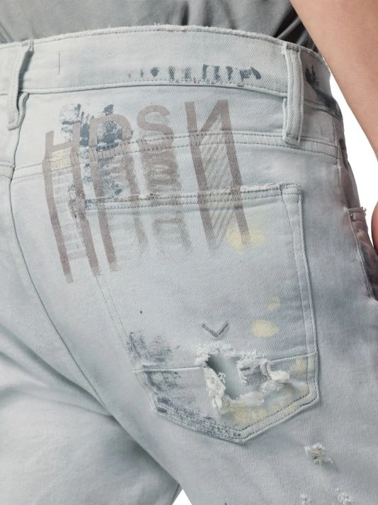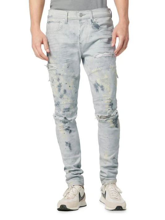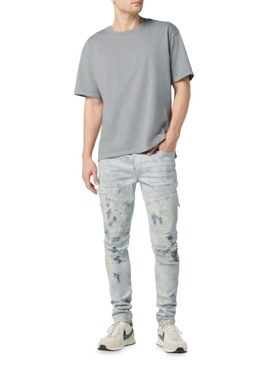 These skinny jeans feature paint splatter details, intentionally distressed details, and flat seam details.